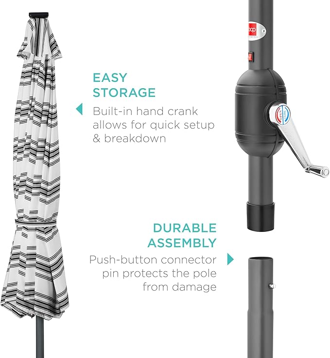 - CONVENIENT CRANK HANDLE: Easy open/close system puts the umbrella up in just seconds with minimal effort