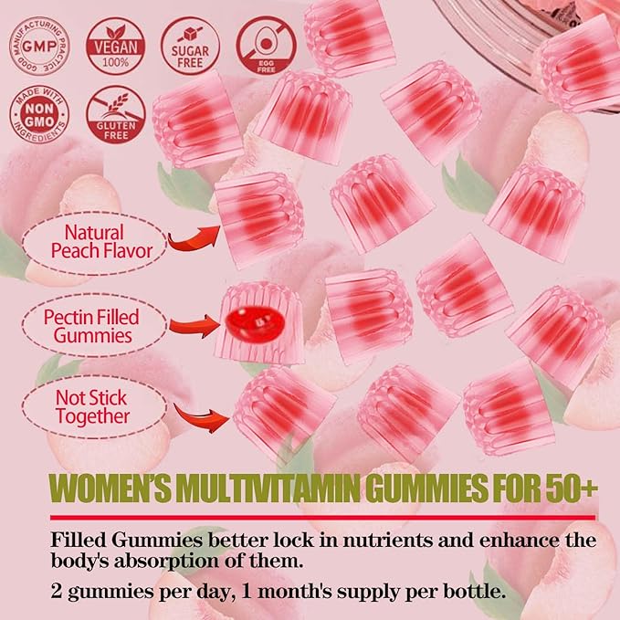 - VEGAN PEACH FLAVOR GUMMIES: women's 50+ multivitamin gummies all ingredients are natural,organic, non-GMO, sugar-free, gluten-free, no artificial flavors and preservatives and won't increase physical burden. The multivitamin gummies are easy to chew and swallow, perfect for you.