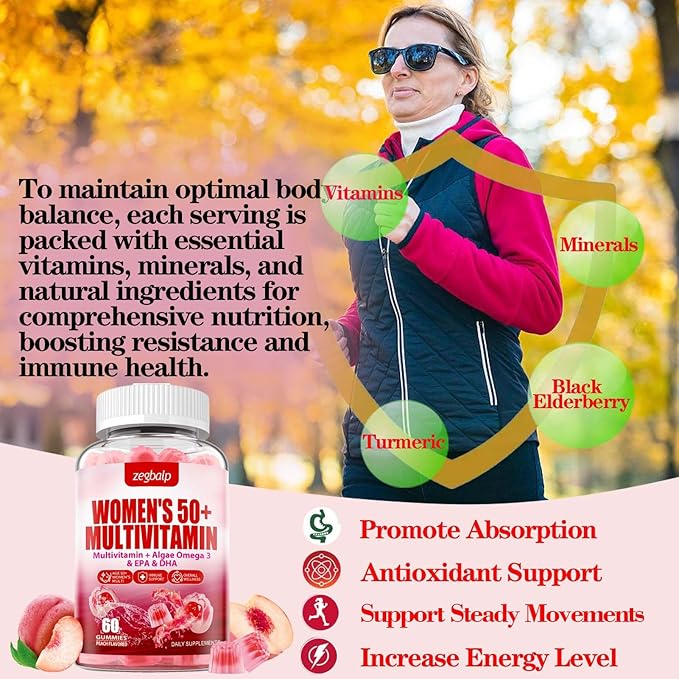 - Product Benefits : Women & Men's 50+ Multivitamin Gummy, Algae Vegan Omega 3 & Calcium, Magnesium, Daily Vitamin A C D3 K2 E, B Complex, Support for Skin, Hair, Energy, Immune Women & Men's 50+ Multivitamin Gummy, Algae Vegan Omega 3 & Calcium, Magnesium, Daily Vitamin A C D3 K2 E, B Complex, Support for Skin, Hair, Energy, Immune