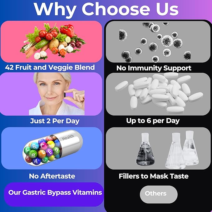 - IRON-ENRICHED VITALITY: Our vitamins with iron are key to maintaining healthy energy levels and preventing anemia, especially crucial after gastric bypass surgery.