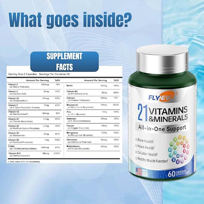 - Balanced Multivitamin for Women and Men: Flynew's unique 21-in-1 multivitamin capsules are specially formulated to bridge the nutritional gap and support a healthy diet — forging a path for those striving for daily health and wellbeing.
