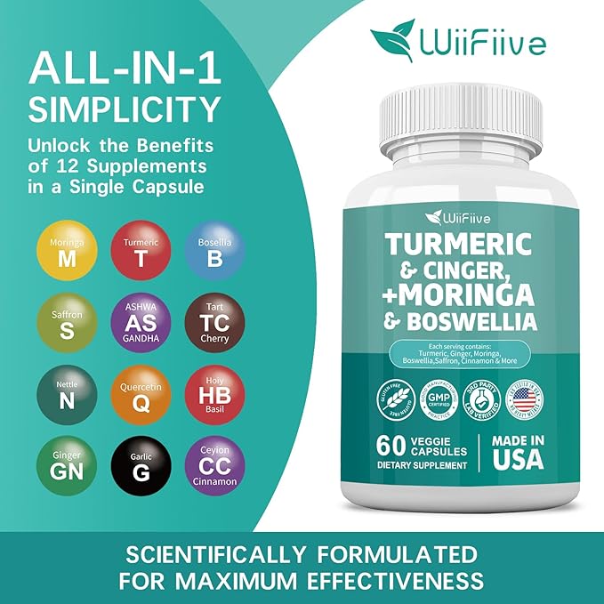 Turmeric Curcumin 30000mg Moringa 50000mg Boswellia 3000mg Cinger 3000mg Cinnamon Saffron Joint Support Supplement for Women and Men with Quercetin Holy Basil Garlic Nettle, 60 Capsules