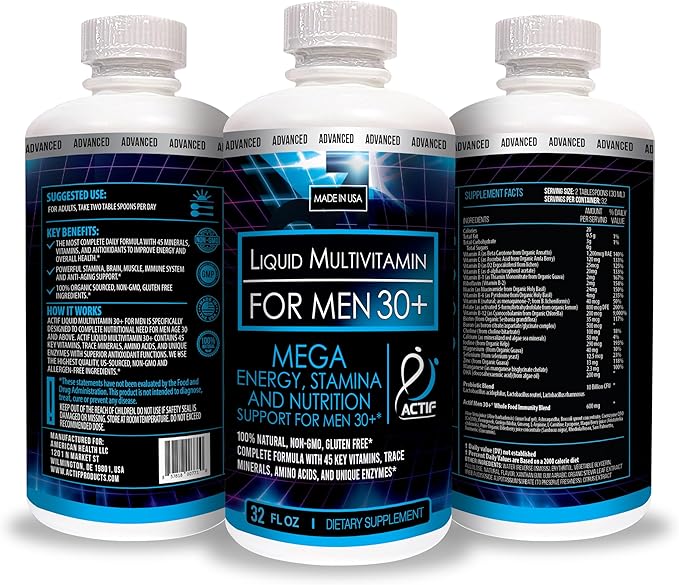 - ACTIF Liquid Daily Multivitamin for Men Age 30+ with 40 Advanced Factors – Non GMO, Made in USA, 32oz. Expiration: 05/2026.