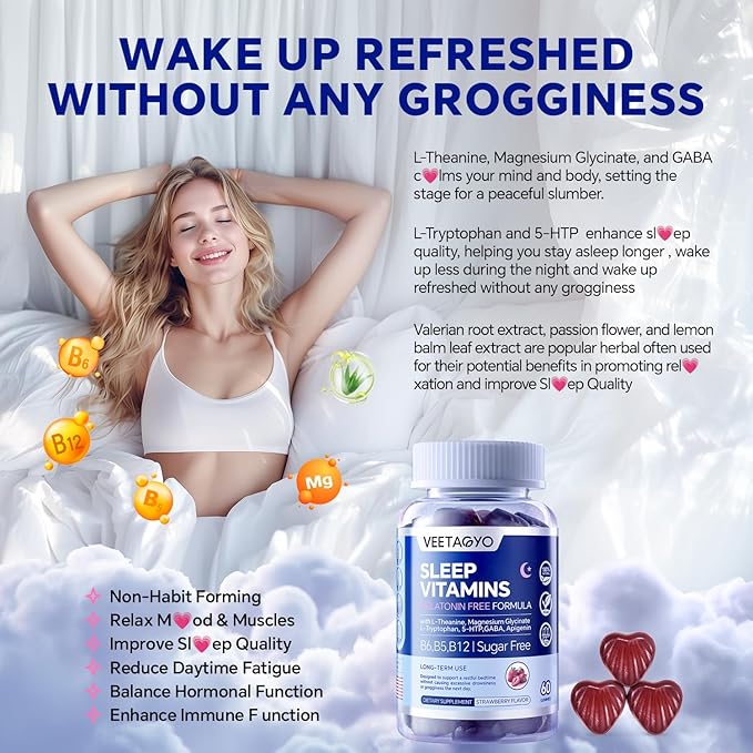 - 🌛Melatonin-Free Sleep Aid: Say goodbye to groggy mornings! Our melatonin-free formula supports a restful night's sleep without the next-day drowsiness. Sweet dreams guaranteed! With an effective formula to promote natural zz💗z.Our melatonin-free gummies are your best choice! 5-HTP, is a precursor to serotonin, is converted into melatonin that is involved in regulating natural Zz💗z cycle. Combines L-Tryptophan, which can increase the concentration of serotonin in the brain, promote the formation of melatonin for better zz💗z.