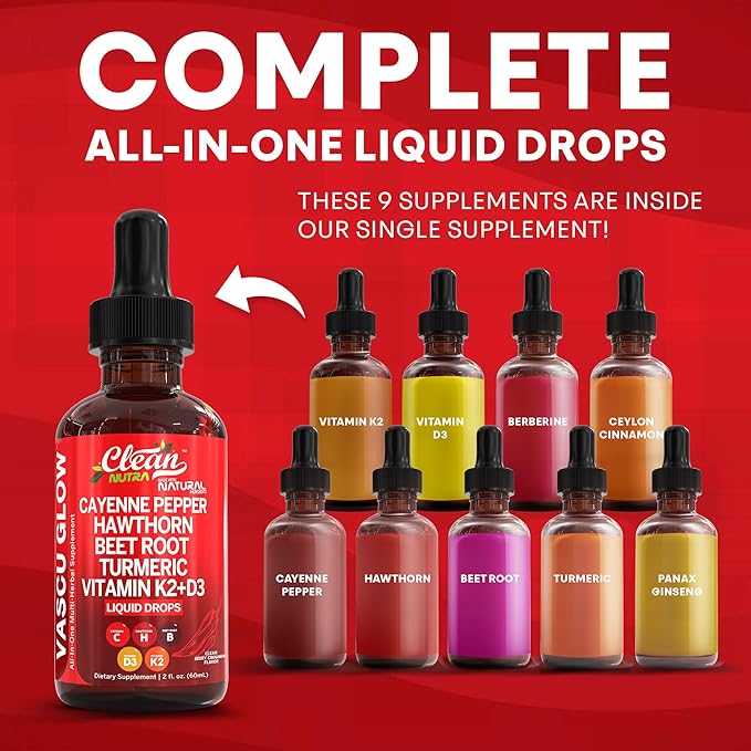 • Clean Nutra Vascu Glow All in One Supplement Cayenne Pepper Liquid Drop - A powerful blend of time-tested herbs and vitamins like Ceylon cinnamon organic, hawthorn berry supplement, beets, turmeric supplement, K2 D3 vitamin supplement, ginseng supplement, and berberine with Ceylon cinnamon. These vegetarian liquid droppers provide a concentrated botanical formula that supports daily wellness and overall balance.
