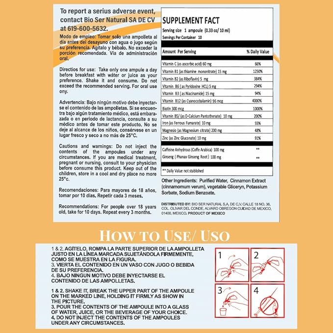 B Complex, Complejo B 1000 Shot | Multi-Vitamins, Caffeine, and Ginseng | Box with 10 Ampoules of 10ml | Energy, Cognitive Function, and Metabolic Health Boost.