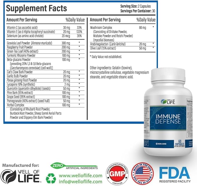 Immune Defense 600mg | 60 Veg Capsules. Enhance Immune Health with a Potent Blend of Graviola Leaf, Raspberry Fruit, Green Tea, Turmeric, Garlic. Boost Your Well-Being Naturally.