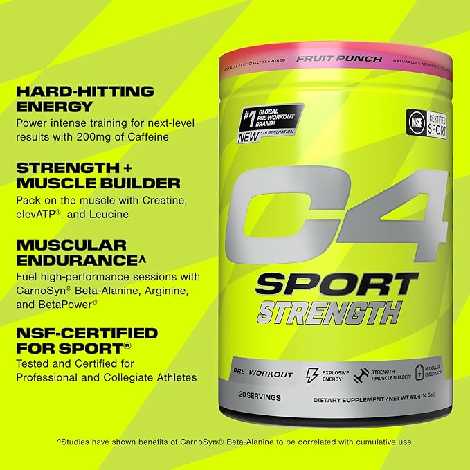 Cellucor C4 Sport Strength Pre Workout Powder - NSF Certified for Sport - Beta-Alanine, Creatine, 200mg Caffeine - Sugar Free Energy Supplement for Men & Women - Fruit Punch, 20 Servings