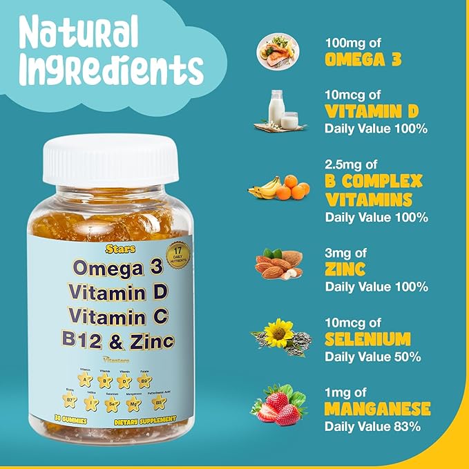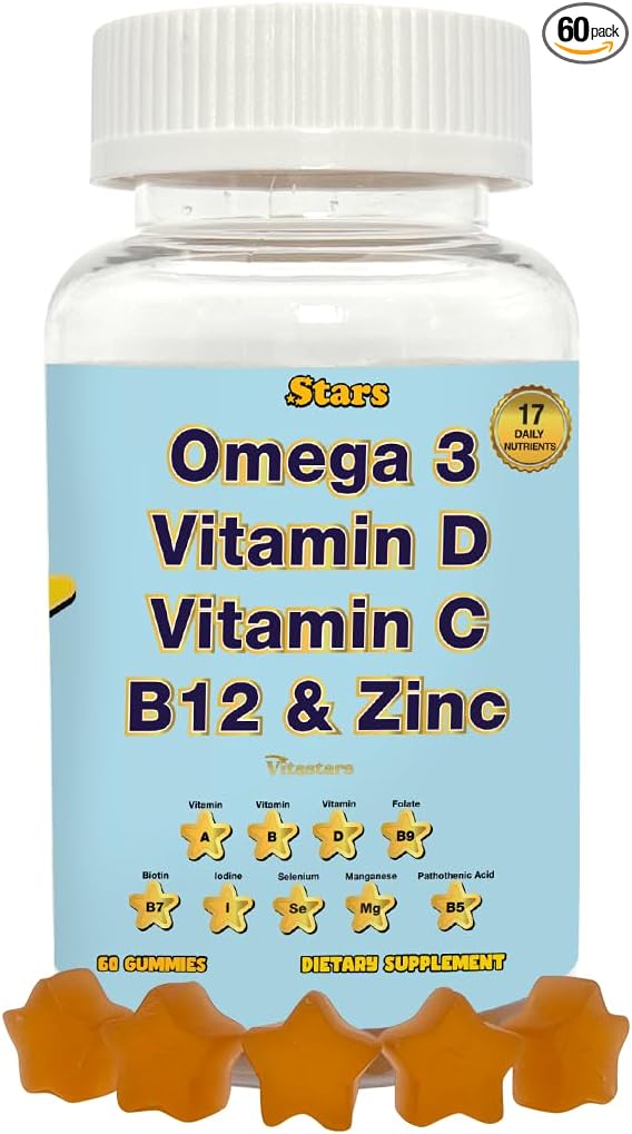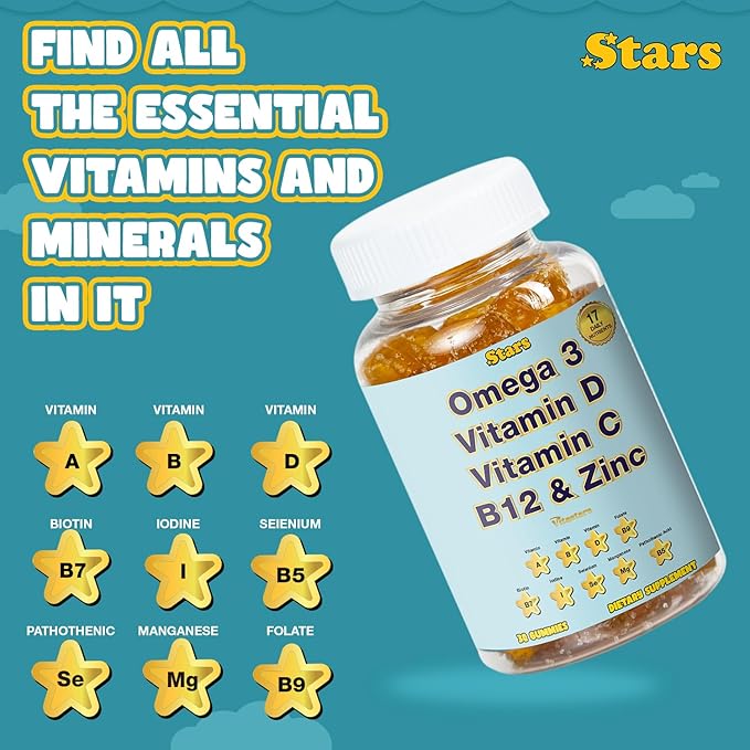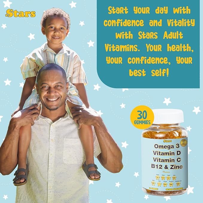 Adult Multivitamin Gummy with Omega 3, Chewable Multivitamin with Selenium, Vitamin A, B, C, D, Biotin, Multivitamin for Women, Multivitamin for Men, 60 Star Shaped Multivitamin Gummies