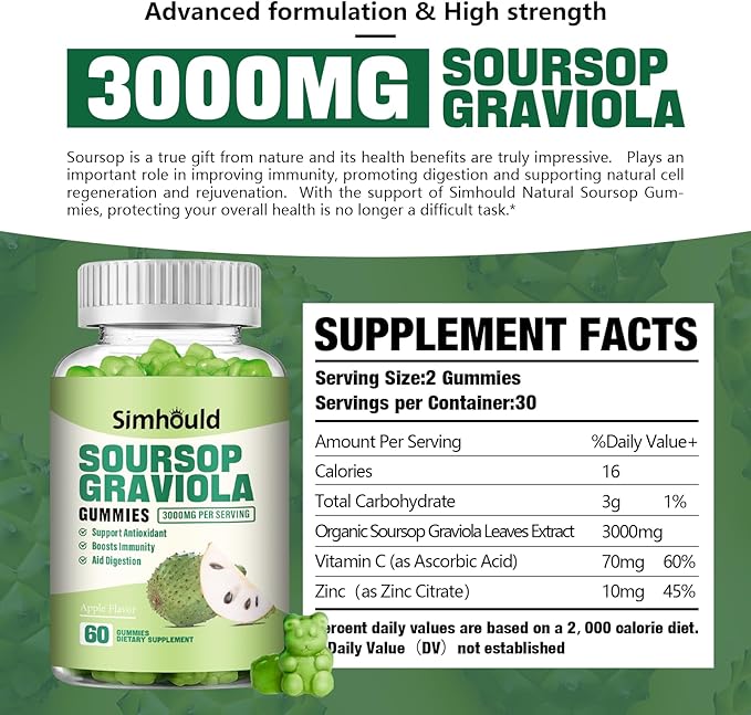 - Why Choose Simhould : Each soursop garaviola gummy contains 3000mg organic soursop graviola leaves extract,70mg Vitaminc,10mg zinc,3mg Total Carbohydrate are an easy to take gummy suitable for women,men and adults. Simhould Supplements gummies are gluten-free,gelatine-free. And it's pectin-based. You can incorporate them into your daily life.