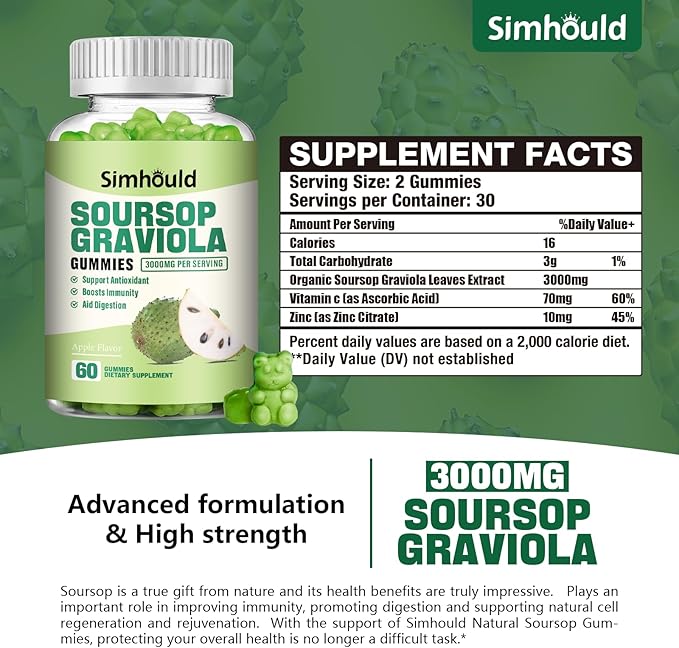 - Why Choose Simhould : Each soursop garaviola gummy contains 3000mg organic soursop graviola leaves extract,70mg Vitaminc,10mg zinc,3mg Total Carbohydrate are an easy to take gummy suitable for women,men and adults. Simhould Supplements gummies are gluten-free,gelatine-free. And it's pectin-based. You can incorporate them into your daily life.