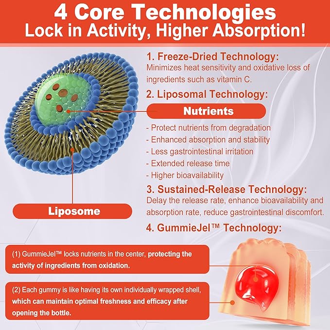 - 4 Core Technologies - high stability, absorption & bioavailability. Freeze-Dried technology Minimizes heat sensitivity & oxidative loss of nutrients such as vitamin C. Liposome technology protects nutrients from being destroyed by gastric juice. Sustained release technology slows down the release rate of nutrients. GummieJel technology allows an inner liquid-filled layer to lock in vitamins, such as vit C & B complex, while a protective pectin layer stabilizes & maintains effectiveness.