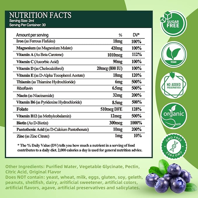 - HIGH POTENCY LIQUID IRON WITH MULTIVITAMIN: The energy support fomula contains 18mg highly bioavailable form of ferrous chelate Iron, Magnesium, a natural source of Vitamin A C D, and vibrant B-complex vitamins (B1 to B12, ) to optimize iron absorption and utilization. The high potency liquid iron with multivitamin ensuring a substantial boost for adults dealing with iron deficiency or anemia*, support energy and overall wellness