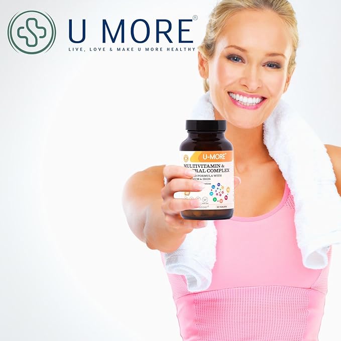 U-MORE Multivitamin & Mineral Complex, Vegan, Sugar-Free, Gluten-Free, Calcium, Magnesium, Vitamin A, B1, B2, B5, B6, B12, D3, K, C, Iron, Zinc, Supports Immune System & Overall Health - 60 Tablets