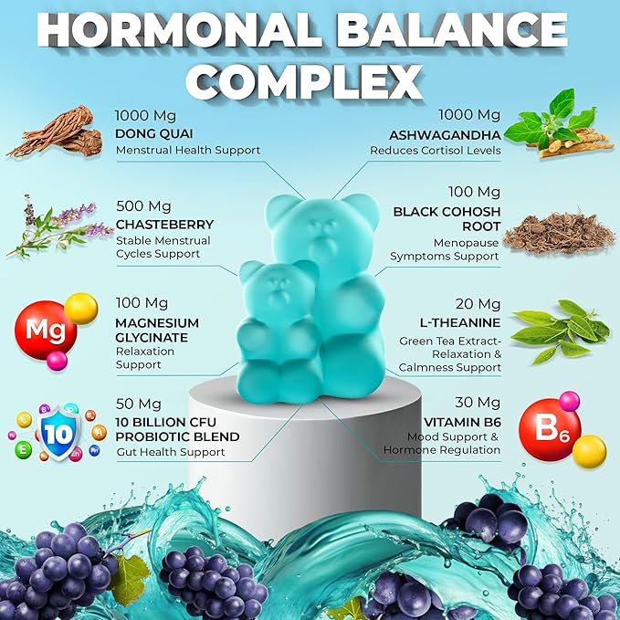 - đź’– PMS GUMMIES HORMONAL BALANCE FOR WOMEN: Dong Quai, known as the "female ginseng," supports menstrual health, while Chasteberry promotes hormonal balance. Black Cohosh for menopause is recognized for easing discomfort during menopause. These ingredients have been traditionally used to help alleviate symptoms such as menstrual cramp relief, PMS mood swings, and hot flashes menopause relief.