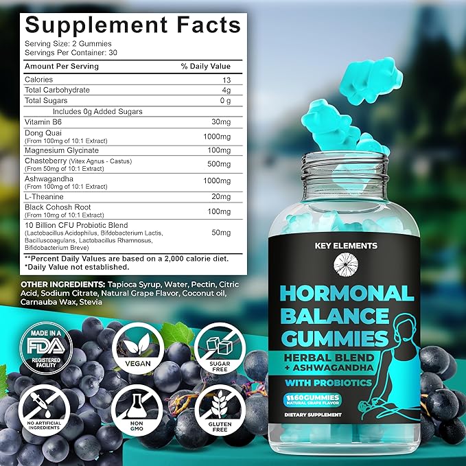 - đź’– UNIQUE HERBAL COMPLEX: Key Elements introduces an innovative formula of PMS Gummies hormonal balance supplements for women, featuring a traditional blend of herbs cherished in ancient Ayurvedic medicine. Dong Quai, Chasteberry, and Black Cohosh Root are powerful ingredients that have been used for centuries to support hormonal balance gummies for women