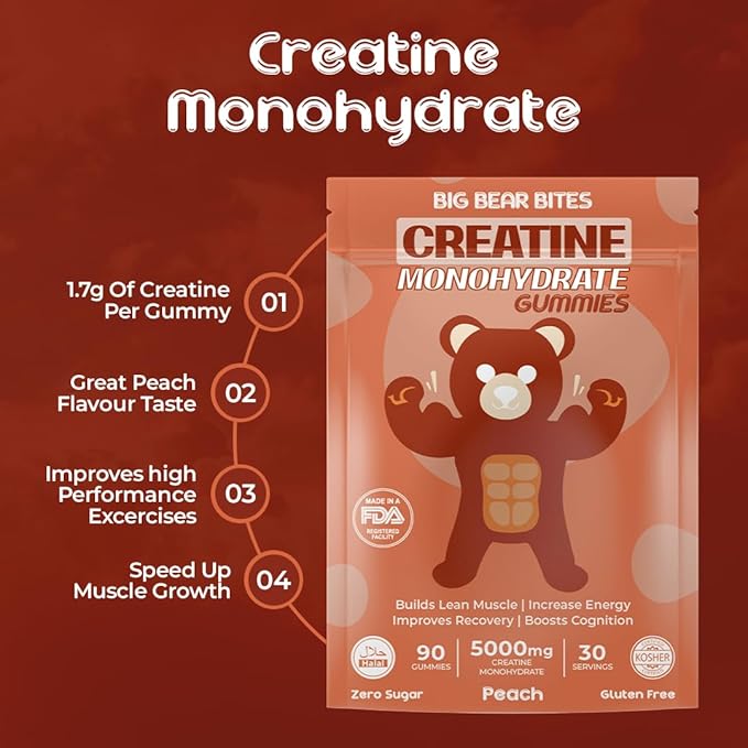 Creatine Monohydrate Gummies for Men & Women | 5000mg of Creatine Gummies per Serving | Sugar Free Gummies, Gluten Free & Halal | Pack of 90 Pre Workout Gummies for Muscle Recovery | Peach Flavor