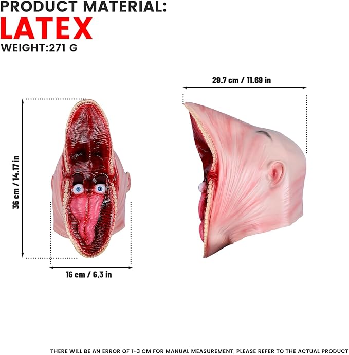 - 【Material】The evil alien monster mask is made of natural latex material, which is environmentally friendly and non-toxic, full of elasticity, and has ample internal space. The latex material may have an odor, please open the package and place it in a ventilated place before use.
