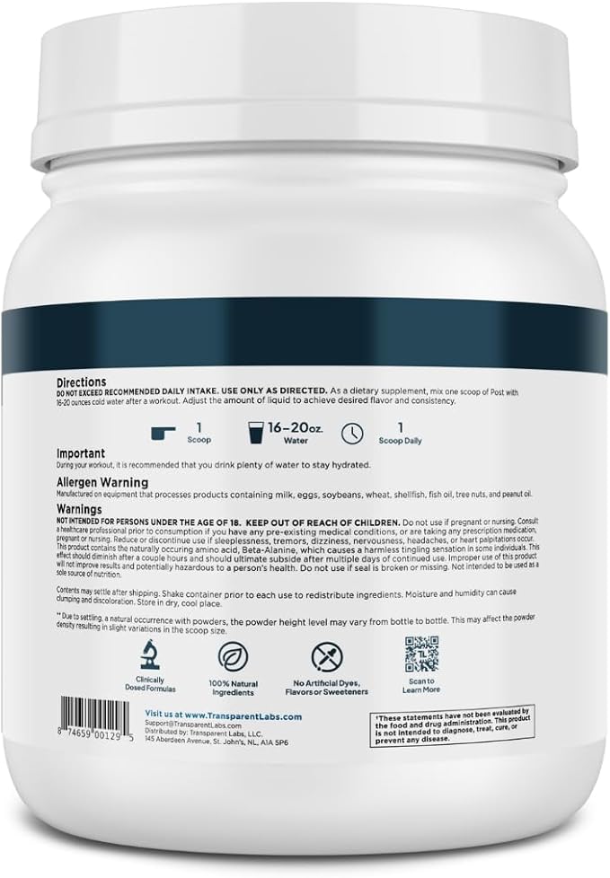- Maximize Muscle Recovery and Reduce Soreness: Transparent Labs Post features clinically dosed ingredients like VitaCherry, BetaPure, L-Glutamine, and BetaPrime to support muscle recovery and minimize soreness after intense workouts.