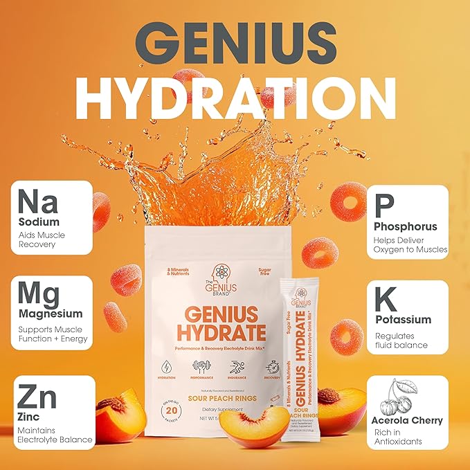 Genius Hydrate Stick Pack Powder Drink Mix - Sour Peach Rings Flavor, Natural Electrolyte Booster with Coconut Water & Potassium for Ultimate Hydration -20 Packets