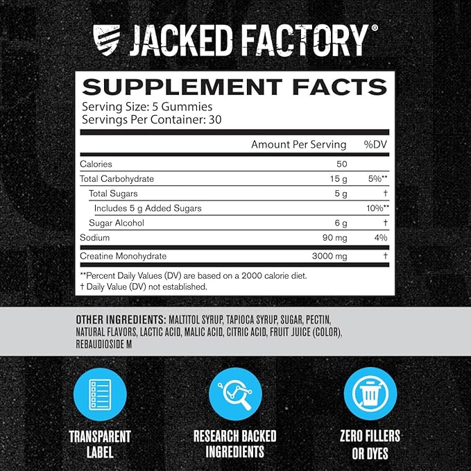 - Creatine Gummies for Men and Women: Jacked Factory Creatine Monohydrate Gummies feature 3000mg of pure creatine monohydrate per 5 delicious gummies. Our gummies allow for convenient dosing of creatine anytime and anywhere without the need to mix it with a liquid.