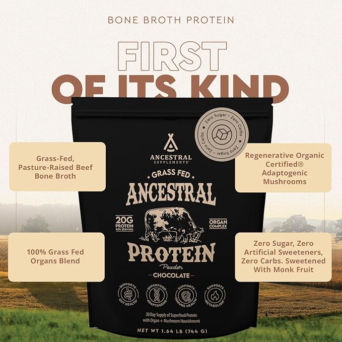 - SUPERFOOD POWDER: We've combined highly concentrated bone broth protein powder, organic mushrooms, and desiccated grass fed beef organs to provide you with Ancestral Protein Powder — a nutrient-dense protein source that helps fuel your body everyday.