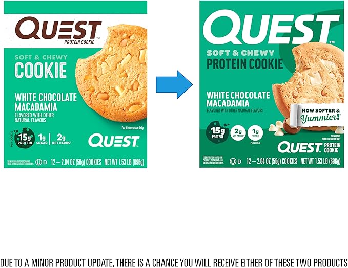 - AT HOME OR ON-THE-GO. Quest White Chocolate Macadamia Flavored Protein Cookies with 15g of grab & go protein* are just right for your morning commute, as a tasty treat at your desk, or a delicious way to refuel after a workout.
