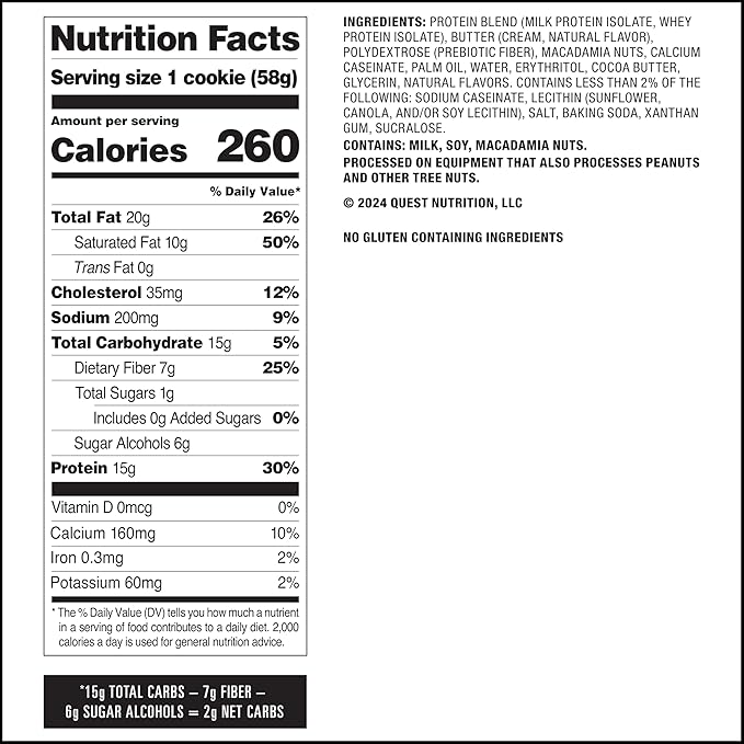- HACK YOUR SNACK. Quest White Chocolate Macadamia Flavored Protein Cookies are now softer & yummier - And with 1g of sugar and 7g of fiber per serving they’re a delicious high fiber, high protein snack to fuel your day.