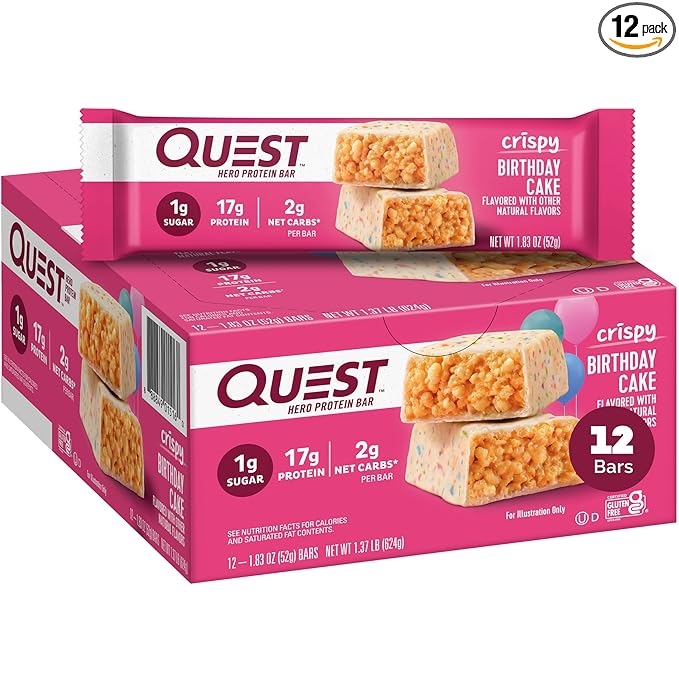 - AT HOME OR ON-THE-GO. Quest Crispy Birthday Cake Flavored Bars with 17g of grab & go protein are just right for your morning commute, as a tasty treat at your desk, or a delicious way to refuel after a workout.