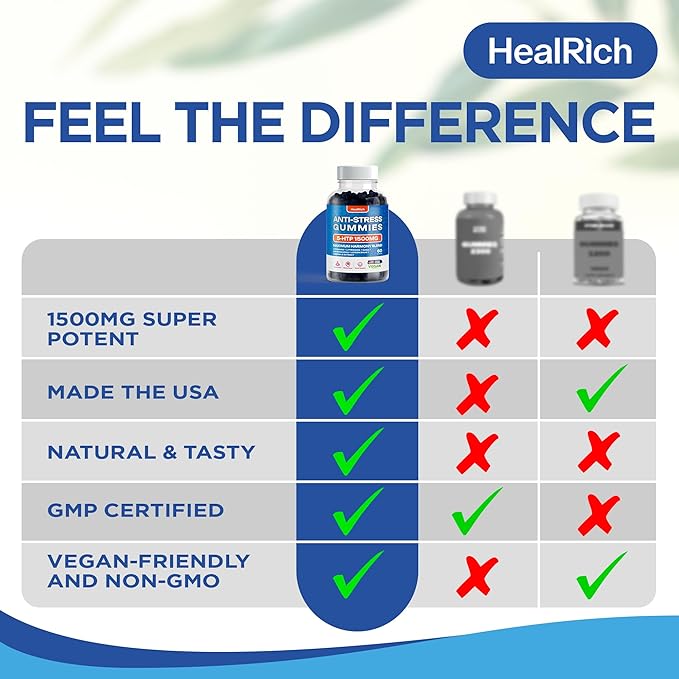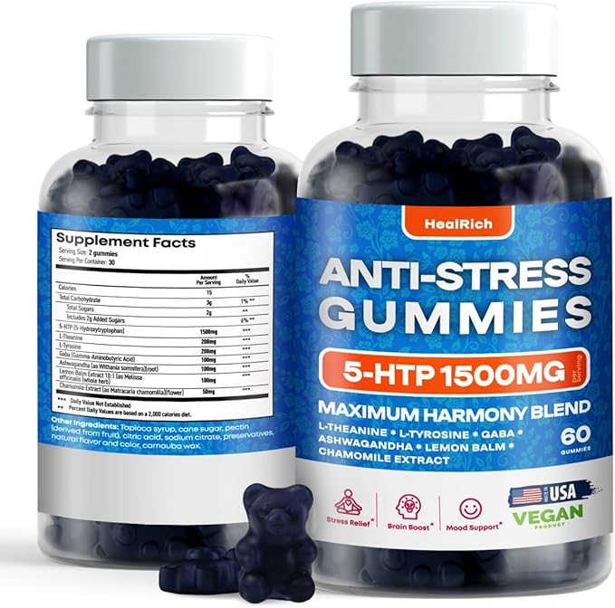 - ๐ OUTSTANDING STRESS RELIEF - Experience natural stress relief with Healrich Anti-Stress Gummies. Filled with 1500MG of 5HTP it may assist with the production of serotonin and help support a positive mood. It will help you unwind and stay calm naturally!