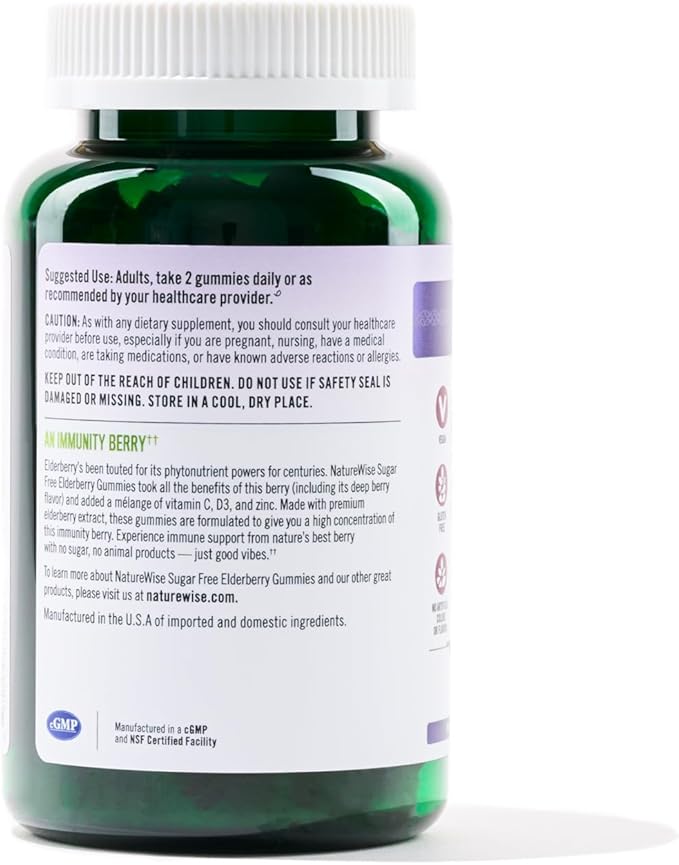 NatureWise Sambucus Elderberry Gummies - Sugar-Free - Daily Immune Support Supplement for Kids and Adults*, with Vitamin C, D3, Zinc - Vegan, Gluten Free, Non-GMO - 90 Count[45-Day Supply]