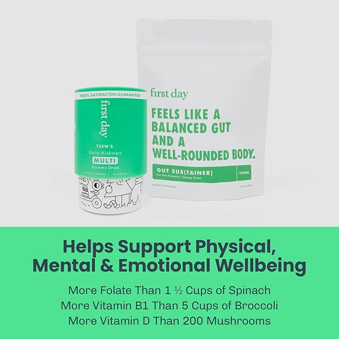 - Backed by Science, No over supplementation: First Day’s unique multi formula is based on more than 35,000 pediatric studies to ensure teens get the right amount of nutrients and do not exceed 100% Recommended Daily Value. Our tribiotic uses clinically studied strains to support gut health.