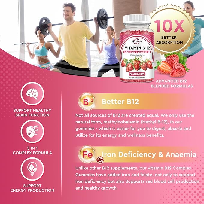 Vitamin B12 Gummies - 5000 mcg Methylcobalamin with Iron, Vitamin C, D3 & Folate, Energy Support and Metabolism, Immune, B-12 Complex Chewable Supplement for Men & Women,Strawberry Flavor