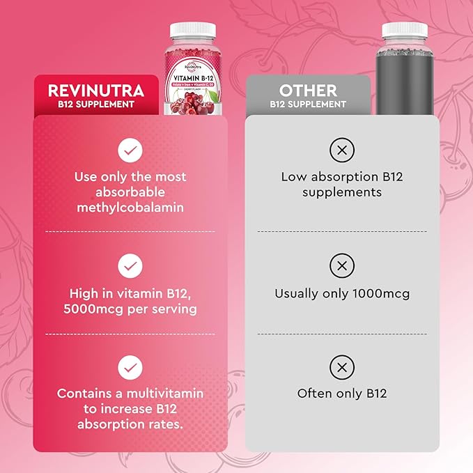 - BRAIN SUPPORT: stay smart & healthy. b12 vitamins gummies unbeatable support for your health goals. Unleash the power of 5000 mcg of vitamin B12 gummy! Red & tasty vitamins with Cherry flavor support cognitive functions and memory at a high level as well as maintain brain energy & functioning