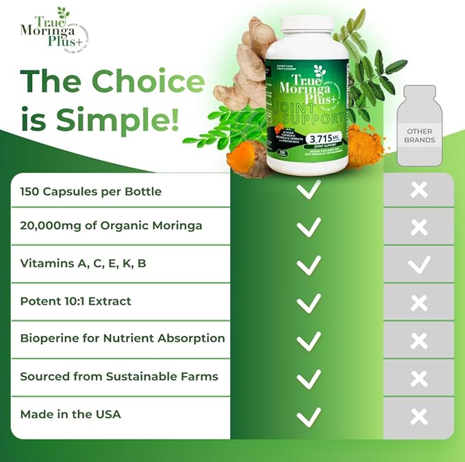 - The True Moringa Plus+ Difference: By combining the soothing properties of Moringa with the targeted benefits of Turmeric, Boswellia Serrata, Ginger, and BioPerine, we offer a comprehensive approach to managing discomfort and supporting your joints. Experience a natural choice for a healthier you!