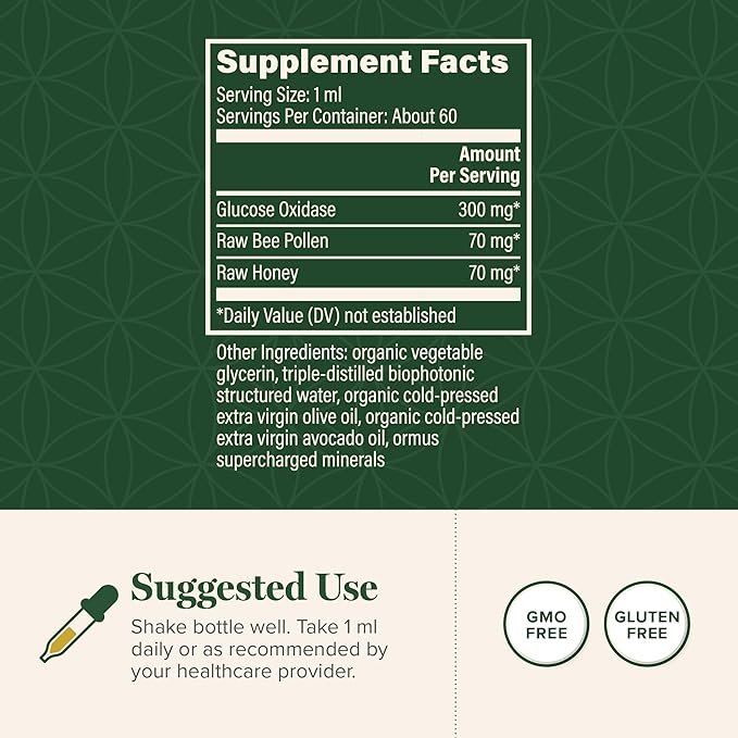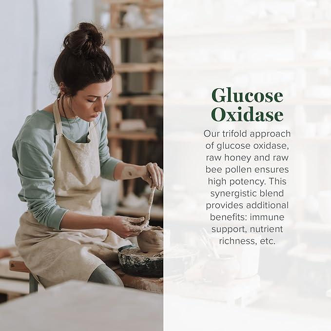 - 3 Natural Sources: Glucose oxidase, raw honey and raw bee pollen.
