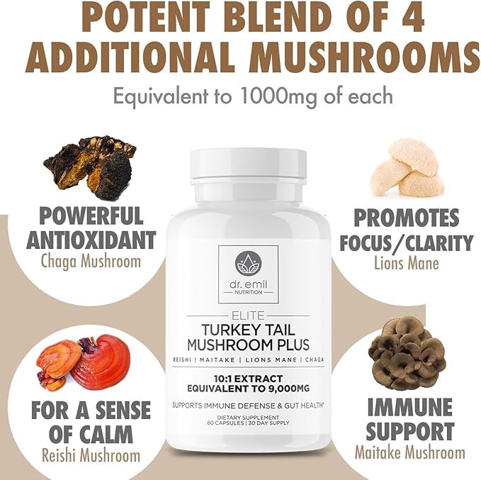 - Added Mushroom Blend: This mushroom supplement isn't just about Turkey Tail. We've incorporated 100mg each of Lion's Mane, Chaga Mushroom, Maitake Mushroom & Reishi Mushroom. All standardized at a powerful 10:1 extract ratio, making them equivalent to 1000mg each.