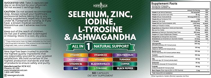 - The Powerful Thyroid Complex & Iodine Supplement You've Been Searching For - New Age Thryroid blend combines five potent products into a single thyroid support formula. It includes a complete zinc supplement, iodine for thyroid health, selenium, tyrosine powder, and ashwagandha, all in just two easy-to-take capsules. Also iodine pills, zinc, and ashwagandha are conveniently packed into one comprehensive solution.