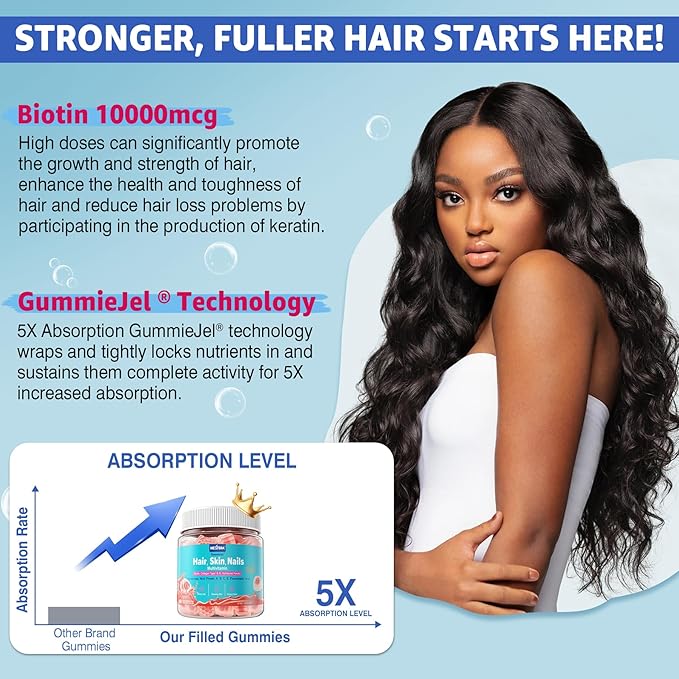 - 【Biotin Collagen Gummies】Packed with 10,000 mcg of biotin and a collagen complex, our gummies deliver the ultimate beauty boost. High-dose biotin promotes faster, more noticeable improvements in hair thickness, shine, and growth, while collagen enhances skin elasticity and nail strength. Compared to lower-dose alternatives, you'll experience quicker, more visible results. Thicker hair, glowing skin, strong nails —nourish your beauty from the inside out!