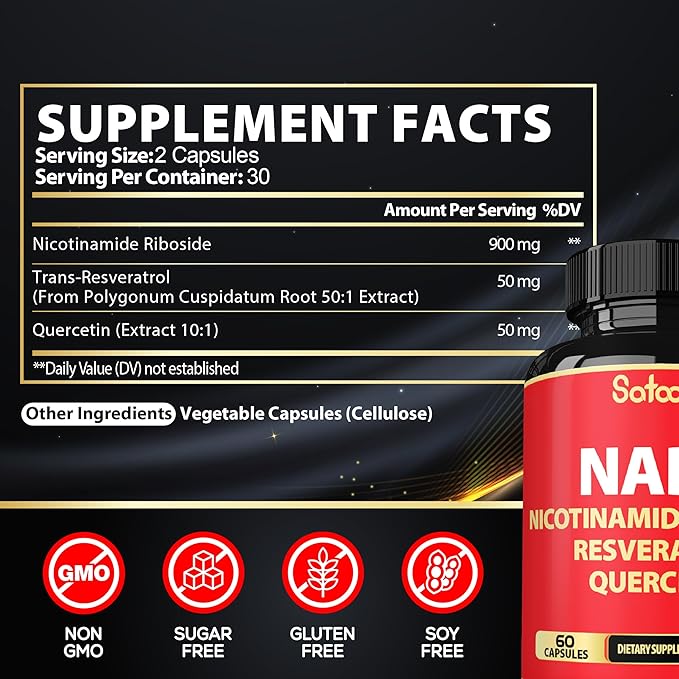 - 🌿 Exclusive Formula Per Capsule: NAD Supplement 3in1 features a potent blend, including Nicotinamide Riboside, Trans Resveratrol, and Quercetin. These work synergistically for your well-being.