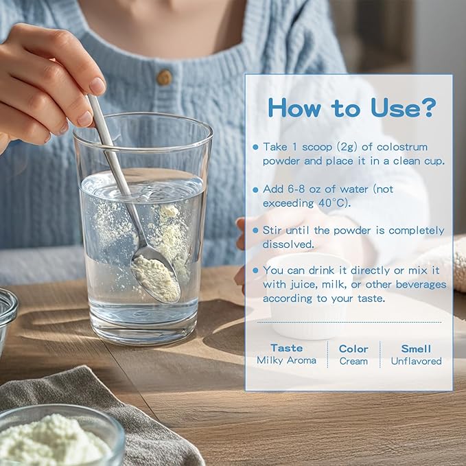 - Daily Supplement: This Bovine Colostrum is unflavored, allowing for easy integration into your daily routine. Add 1 scoop (2 g) to 6-8 oz of water, juice, or your beverage of choice, and feel the charm of nature.