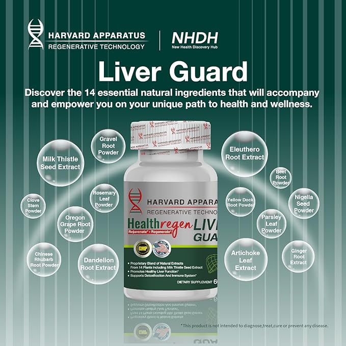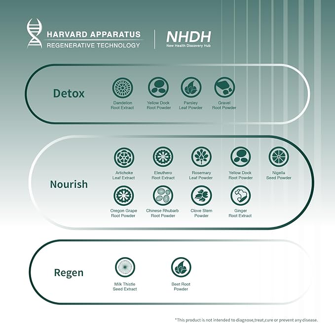 - Ingredients: The formulation incorporates Harvard Apparatus Regenerative Technology, blending clinically validated hepatic protectants including Milk thistle, Artichoke, Dandelion, Gravel Roots, Oregon Grape with 14+ other botanical extracts to optimize liver function