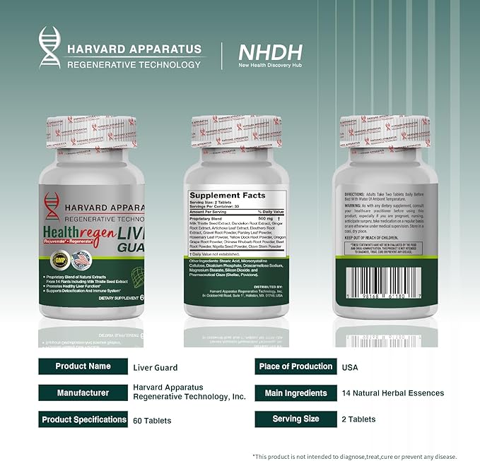 Harvard Apparatus Regenerative Liver Guard 60 Tablets - Liver Cleanse Detox & Repair, Fatty Liver Support Renew Supplement, 14+ Herbs with Silymarin Milk Thistle, Artichoke, Dandelion and More