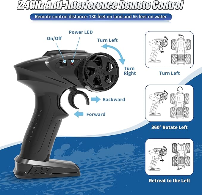 - Powerful 2.4GHz Remote Control: The remote control car uses anti-interference 2.4GHz independent frequency band, and each RC car and remote control are unique frequency pairings, allowing your child to race with multiple RC cars of friends without any interference. This waterproof amphibious RC truck can be driven on water and land, with a remote control range of 65 feet in the water and 130 feet on land, allowing kids to enjoy the fun of racing games