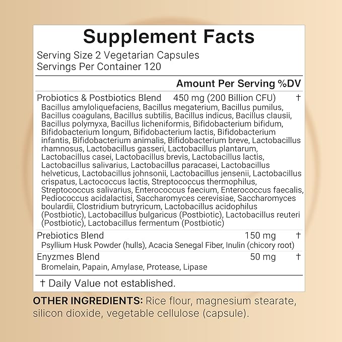 - Full spectrum 5-in-1 digestive enzyme, prebiotic, probiotic, postbiotic, and fiber complex, 240 veggie capsules that offer 120 servings per bottle with maximum potency 200 billion CFU (colony forming units).