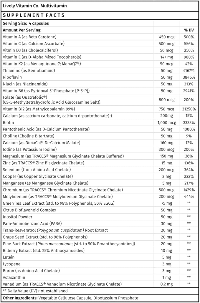 - THIS IS NOT YOUR MOTHERS OR FATHERS MULTIVITAMIN - Lively Vitamin Co Multivitamin is not your average multivitamin. This product contains so many patented and proven ingredients, it's hard to believe that we were able to pack them all into a single serving. From vitamins and chelated minerals, to antioxidants, this multivitamin has it all!
