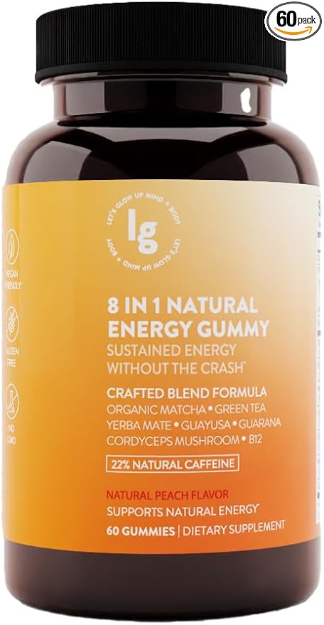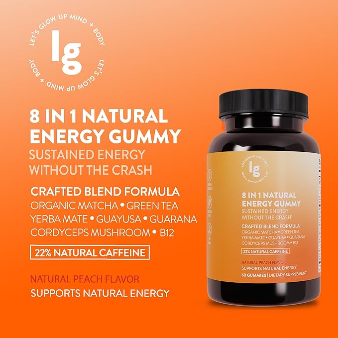 8-in-1 Natural Energy Gummies, Vitamin B12, Sleep Gummies, Womens Multivitamin Gummy, Energy Chews, Vitamin C Gummies, Running Gummies, Peach Flavor, Energy Supplements, 22% Caffeine, 60 Count
