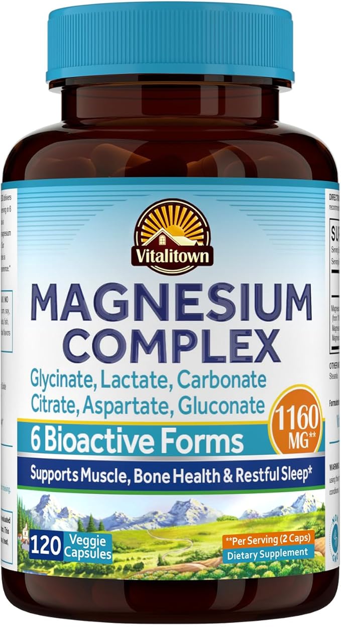 Vitalitown 6-In-1 Magnesium Complex 1160mg Per Serving, Magnesium Glycinate, Citrate, Carbonate, Aspartate, Gluconate & Lactate, High Absorption, Bone, Muscle, Sleep & Digestive Health, 120 Vegan Caps