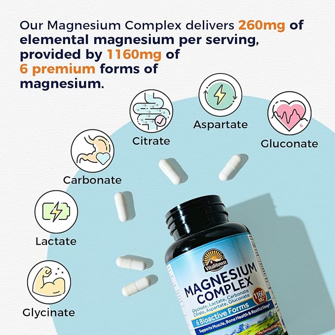 - Well-Absorbed Magnesium Complex: If you're on the hunt for a well-absorbed magnesium complex supplement, then your search ends here. Vitalitown Magnesium Complex delivers 260 mg of elemental magnesium per serving from six of the most bioavailable forms, including magnesium glycinate, citrate, gluconate and more.* Say goodbye to poorly absorbed magnesium oxide, and say hello to a broad spectrum of magnesium that's gentle on your stomach, revitalizing your magnesium levels for a brighter you.*