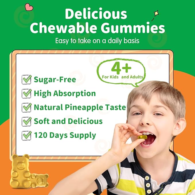 - Sugar Free, Pure & Delicious: Our Kids Magnesium Gummies are completely sugar-free and easy to chew, with a delicious pineapple flavor that everyone loves. Made from natural ingredients and free from artificial flavors, colors and preservatives, these gummies are vegan, non-GMO, and gluten-free. Provide health and happiness for your child with our delightful magnesium gummies (Ages 4-13 take 1 gummy, Ages 14+ & Adults take 2 gummies daily)!*